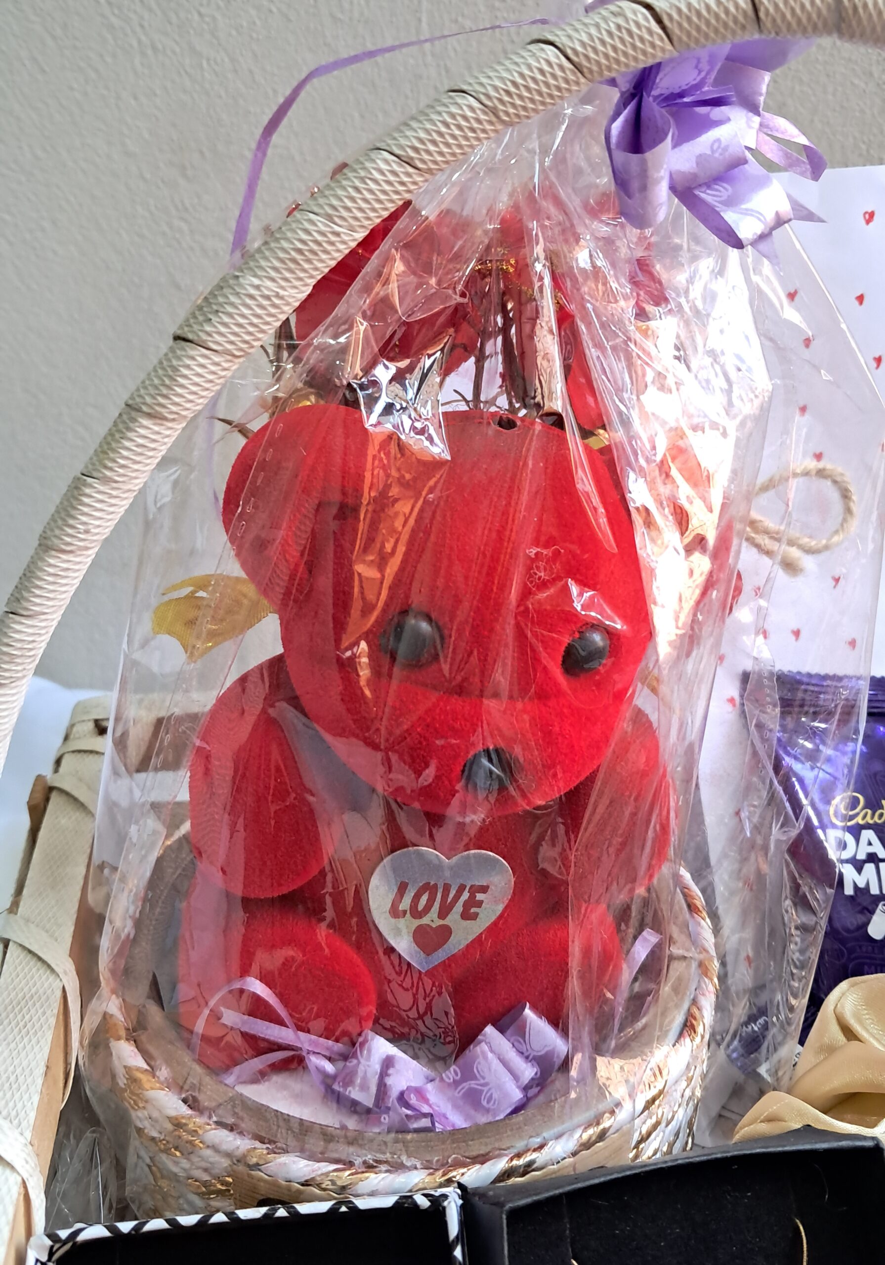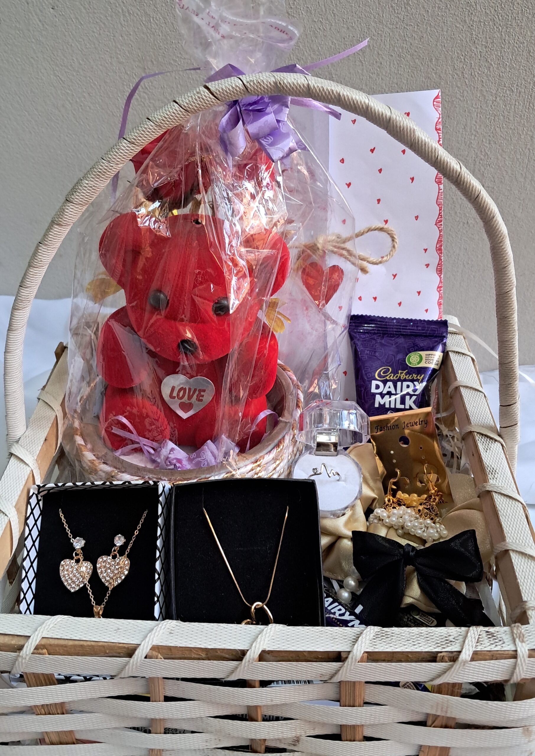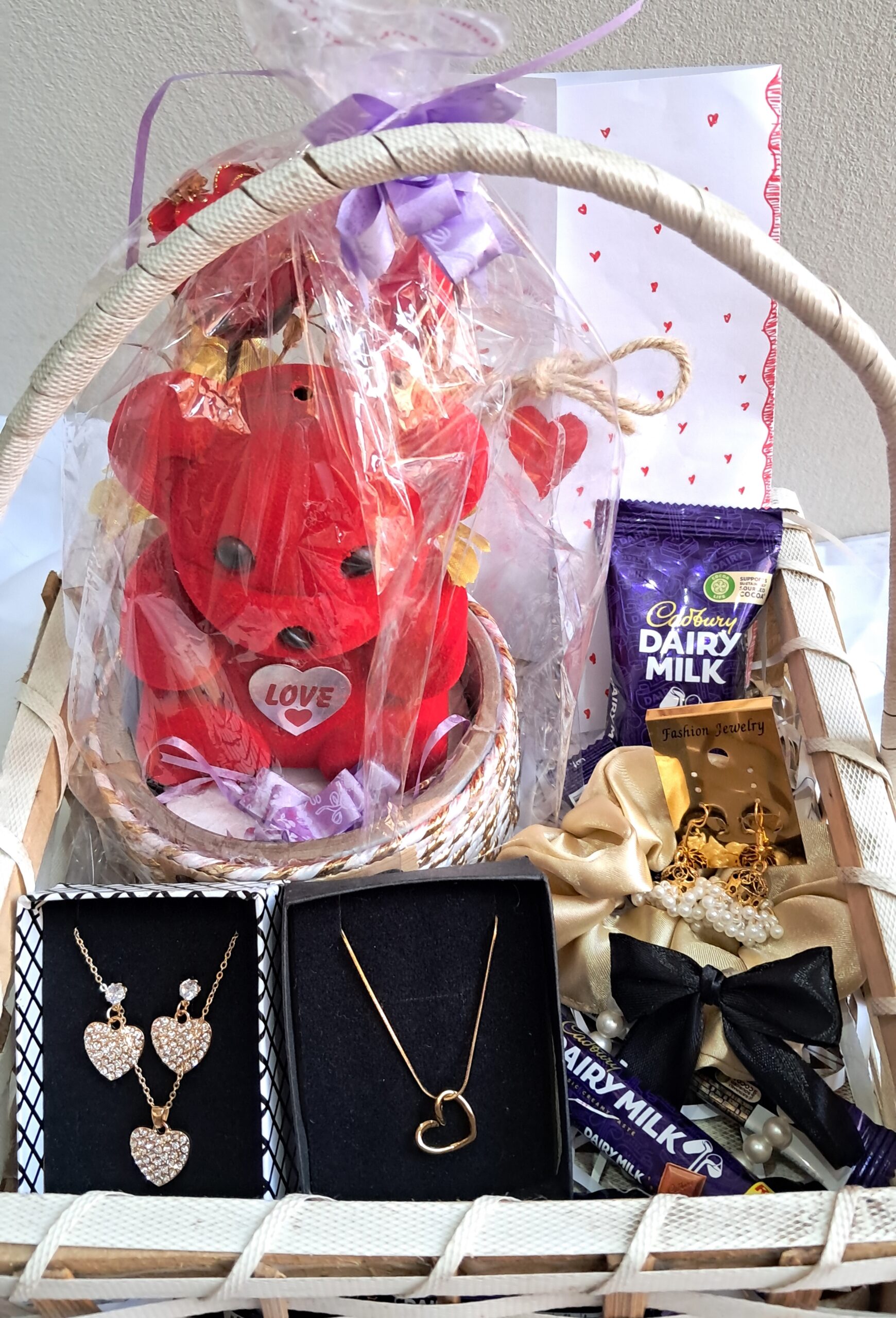 Every item is carefully placed to create a luxury aesthetic look while keeping emotions at the heart of the gift. From sparkling jewelry and cozy teddy love to sweet chocolates and thoughtful accessories, this basket speaks love without saying a word.