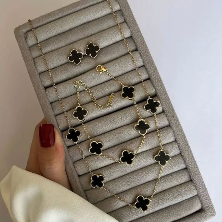 5 Clover Jewellery Set Black (18k Gold Plated)