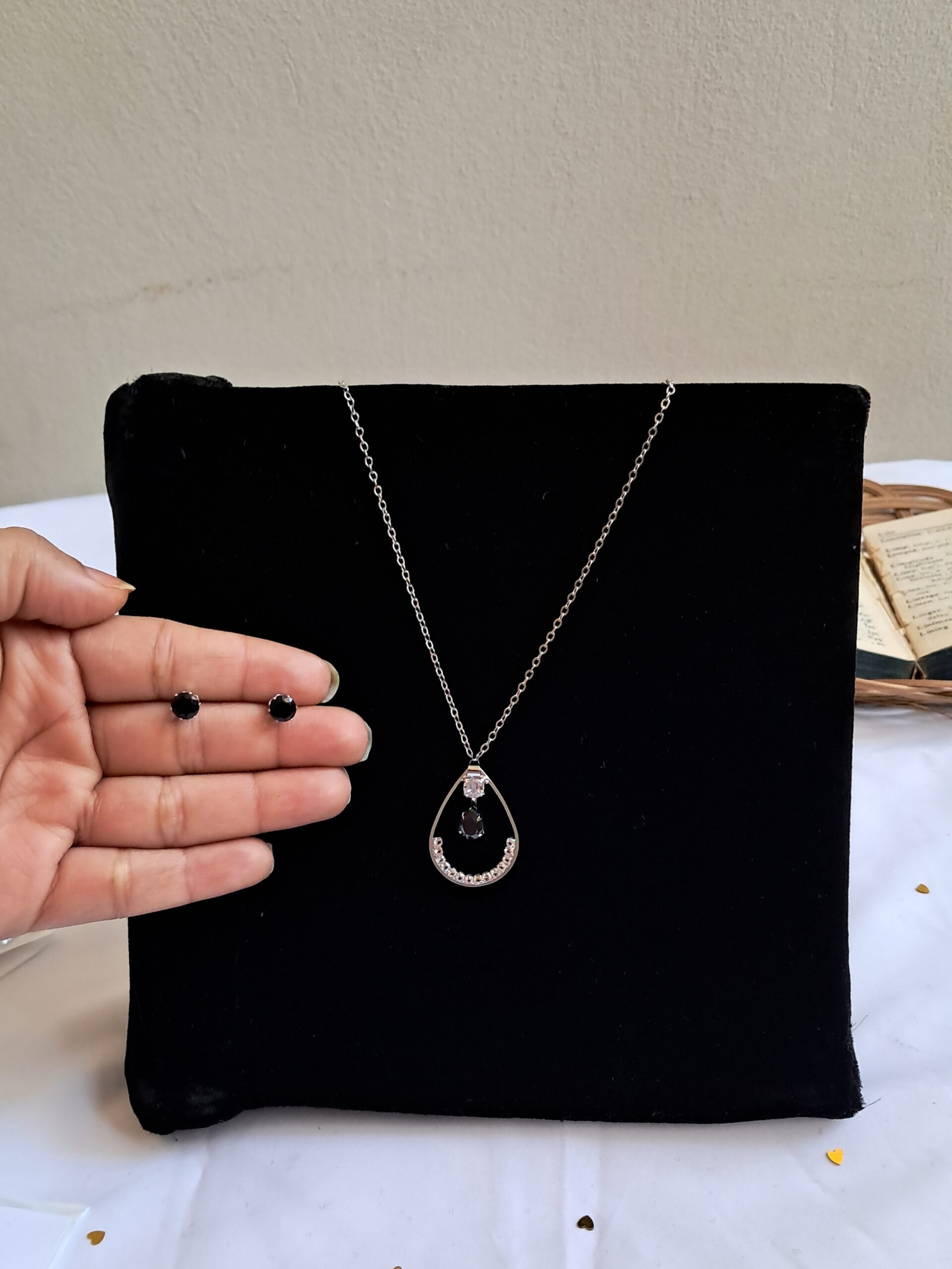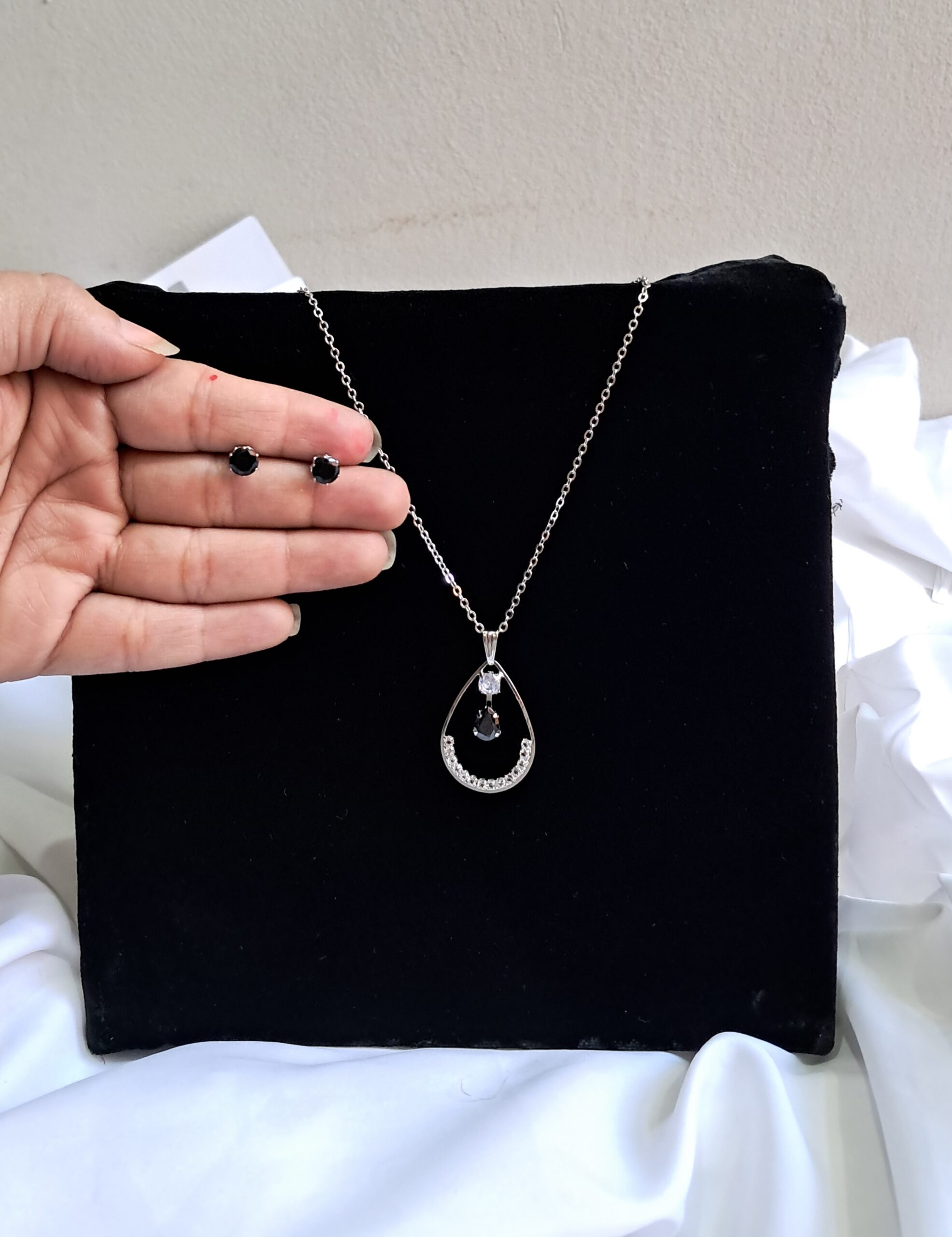 The polished silver tone enhanced with subtle crystal detailing adds a soft shimmer, while the matching black stud earrings complete the look with effortless elegance. Perfect for evening wear, formal occasions, or elevating everyday outfits with a hint of luxury.