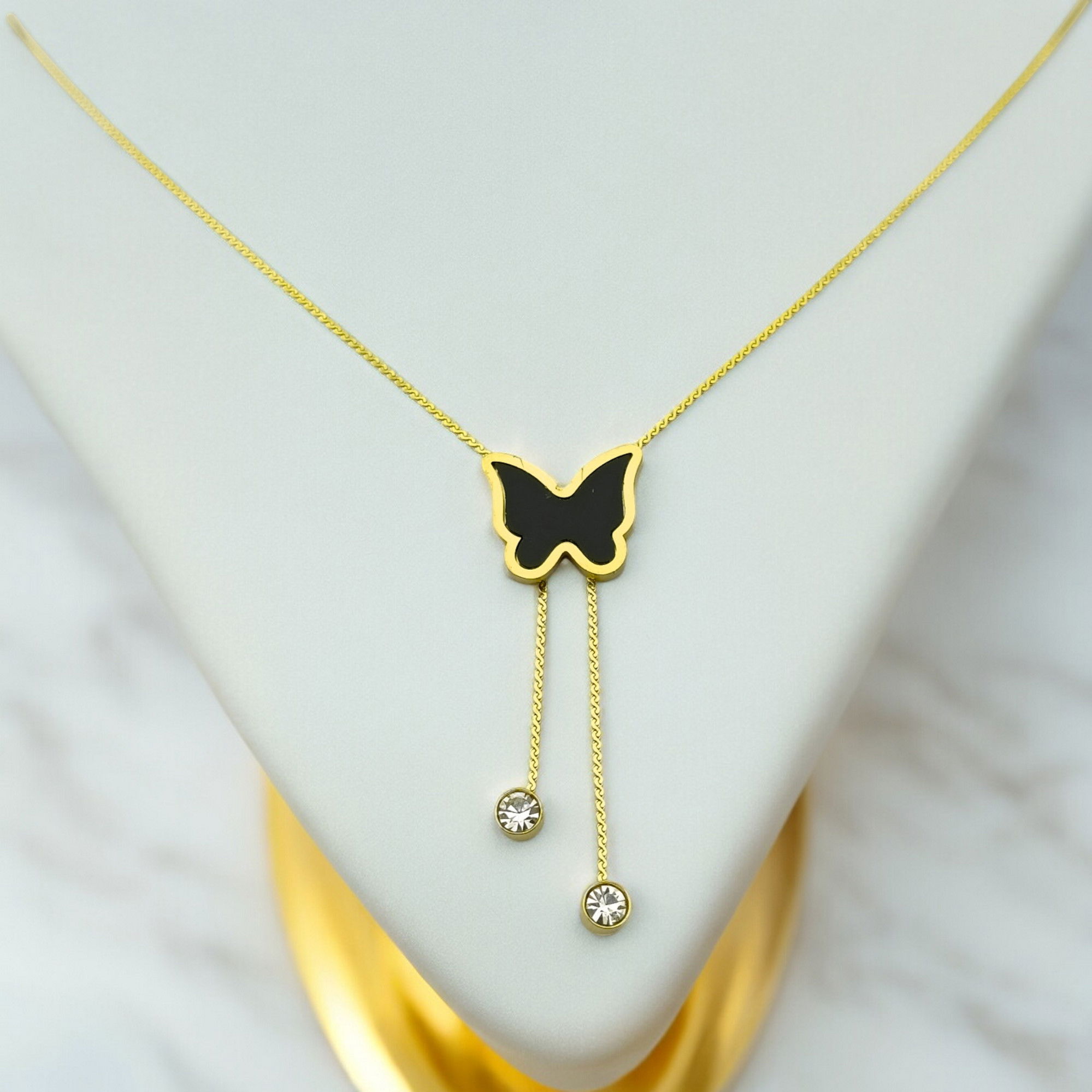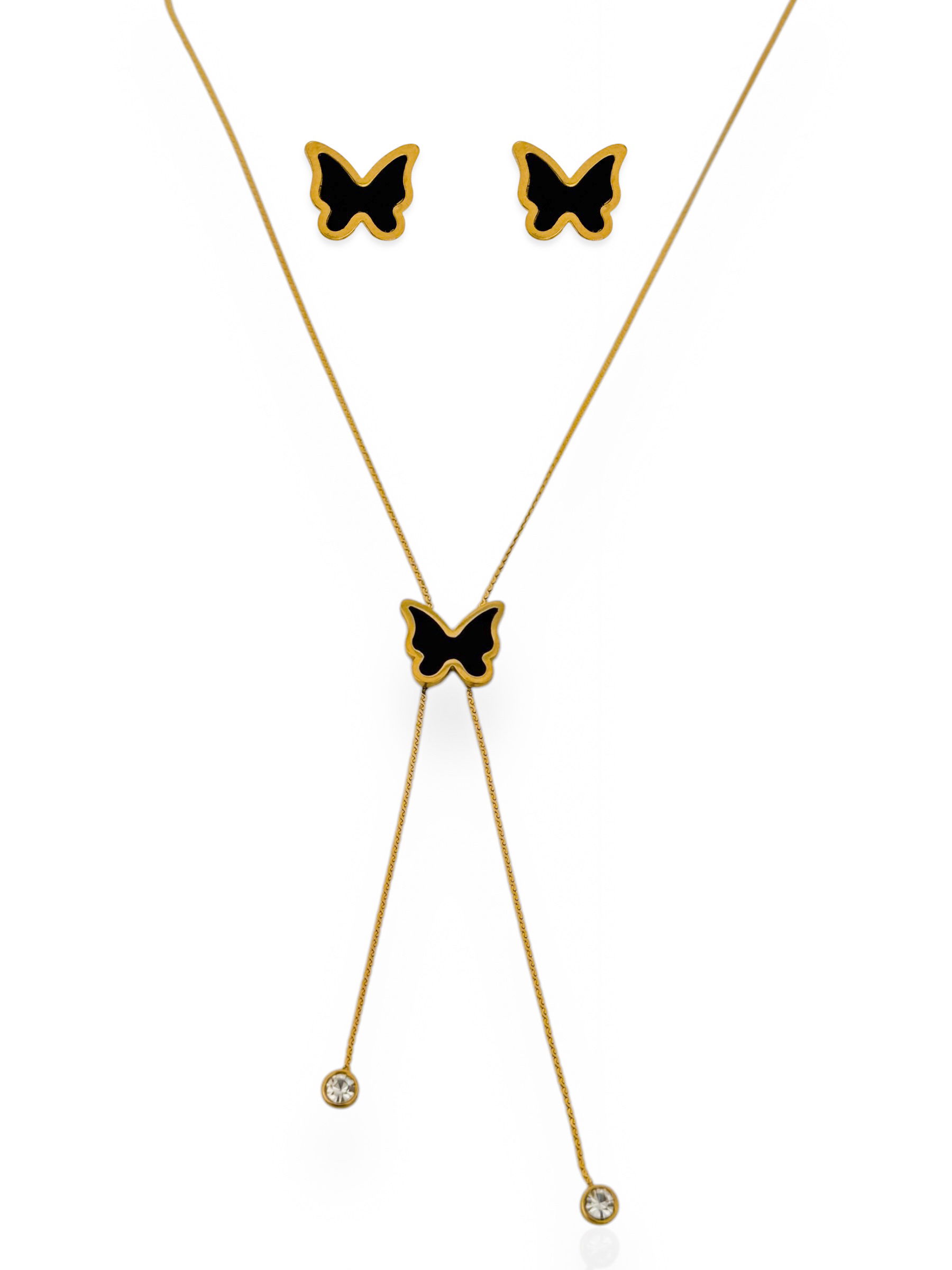The Black Butterfly Set (18k Gold Plated) includes a matching necklace and earrings. Made from stainless steel, this lightweight set is anti-tarnish, water-resistant, hypoallergenic, and safe for sensitive skin—perfect for daily wear with an elegant butterfly design. ✨