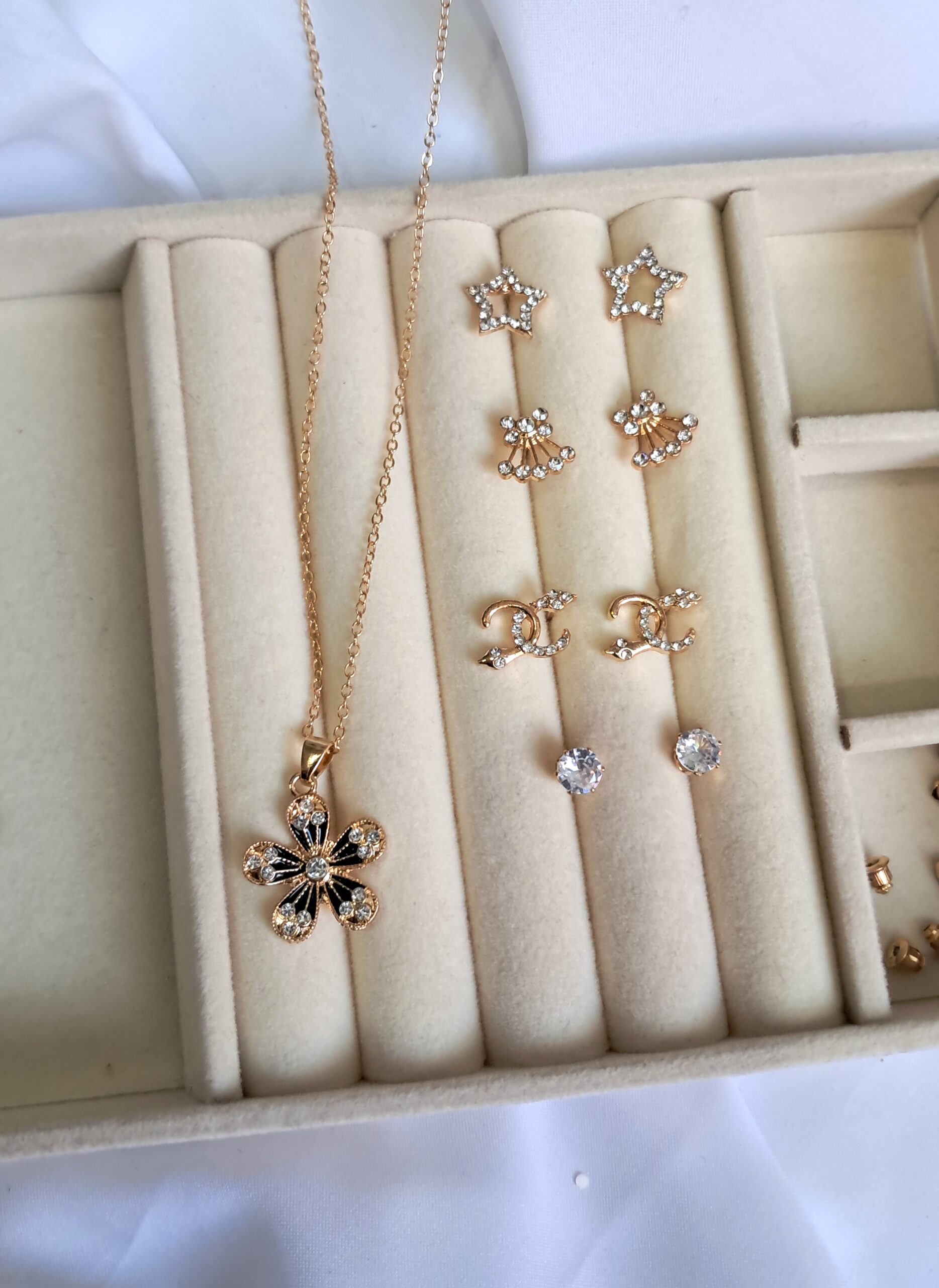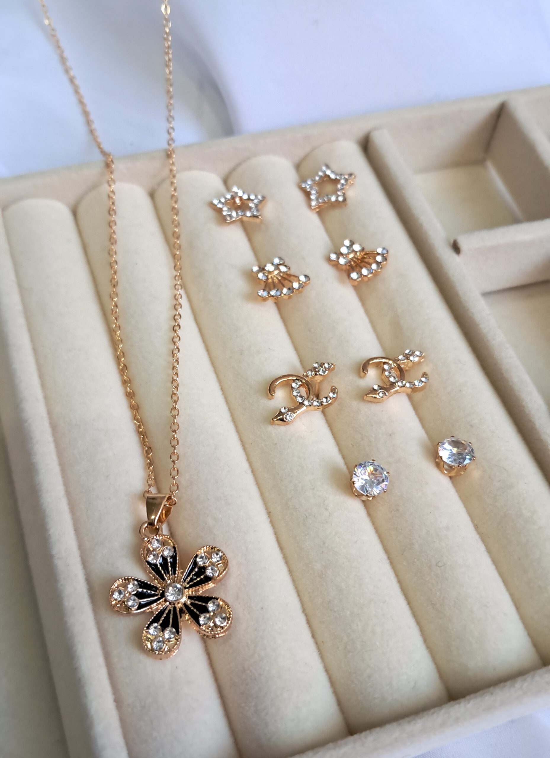 Cherry Blossom Floral Set 🌸is designed to bring delicate elegance and feminine charm to your style. Featuring a cherry blossom-inspired necklace paired with four matching pairs of earrings, this set gives a soft, graceful, and versatile vibe🌸
