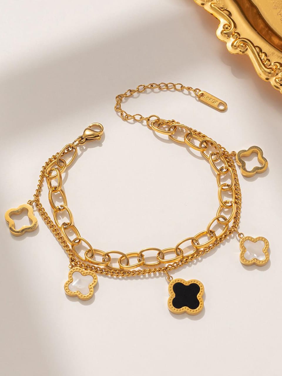 Featuring a double-chain style paired with a black clover charm, this bracelet adds depth, contrast, and sophistication to your look. Crafted with durable stainless steel, it ensures long-lasting shine while remaining gentle on sensitive skin—ideal for daily wear, stacking, or gifting.